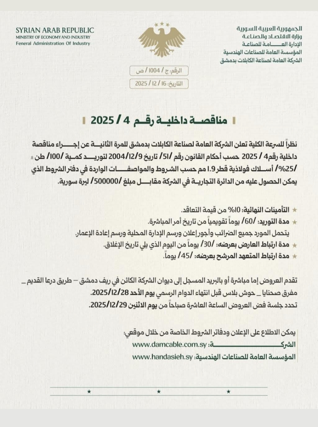 مناقصة داخلية رقم 4/2025